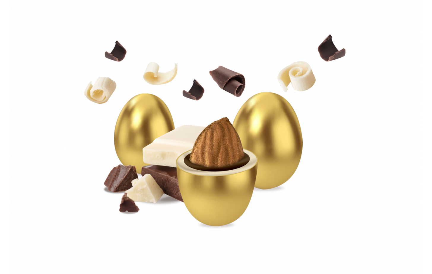 Mandorla tostata ricoperta da cioccolato fondente e bianco e da un sottile strato di zucchero.