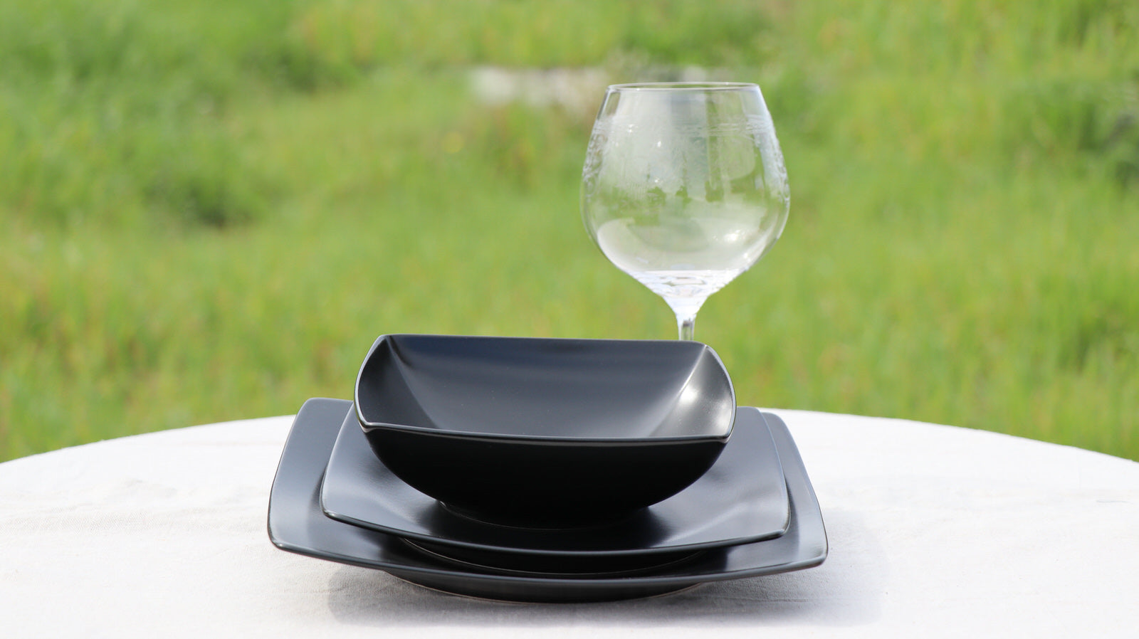 - Dimensioni: piatti piani 25 x 25 cm; piatti fondi 17.5 x 17.5 cm; piatti frutta 21 x 21 cm