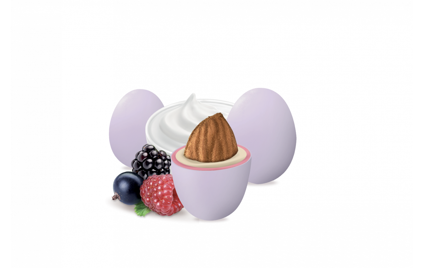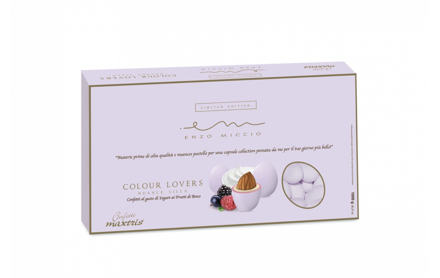 Mandorla tostata ricoperta da cioccolato bianco al gusto di yogurt ai frutti di bosco e da un sottile strato di zucchero.