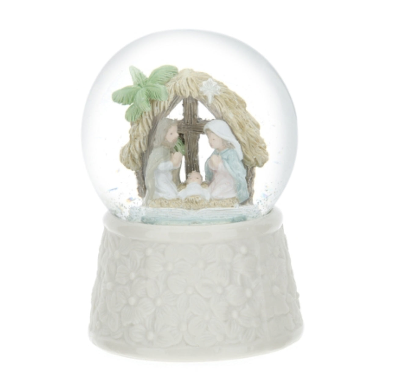 PALLA ACQUA/NEVE SACRA FAMIGLIA CON PALME, BASE PORCELLANA, 6,5X10CM.